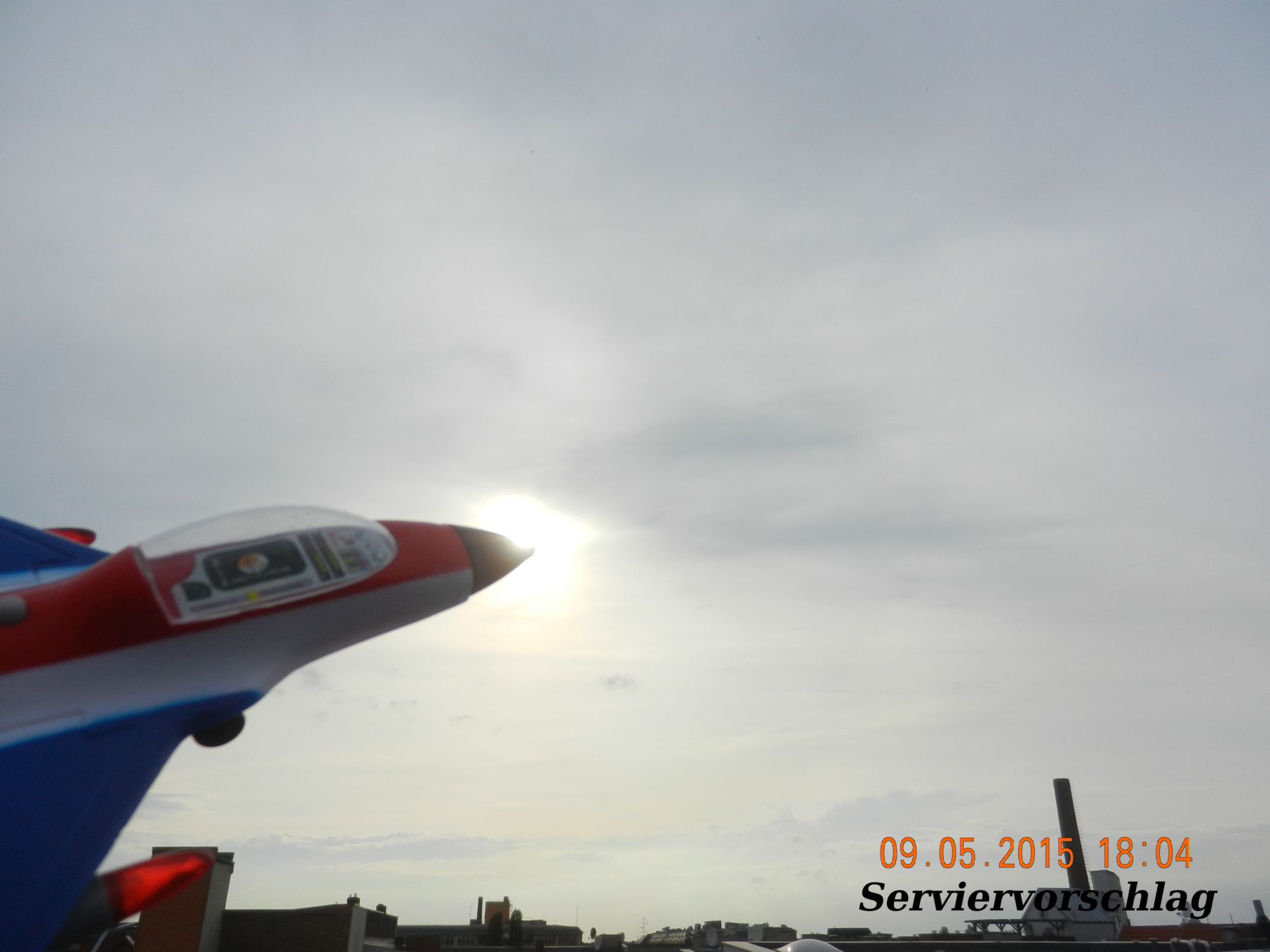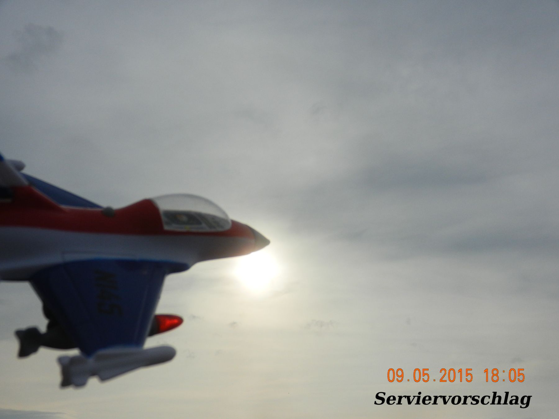 Das Rätsel hat sich aufgelöst – der Typ des Kampfjets ist zwar immer noch unklar, aber das Ding stammt aus chinesischer Massen-Produktion und besteht aus einem der modernsten Werkstoffe – aus Plastik. Es eignet sich hervorragend zum Krieg-Spielen und ist standardmäßig mit vier AAM’s bestückt, die sich jedoch leider nicht abfeuern lassen. Rot-China ist bekanntlich führend in der Herstellung dieser Art von Geräten.