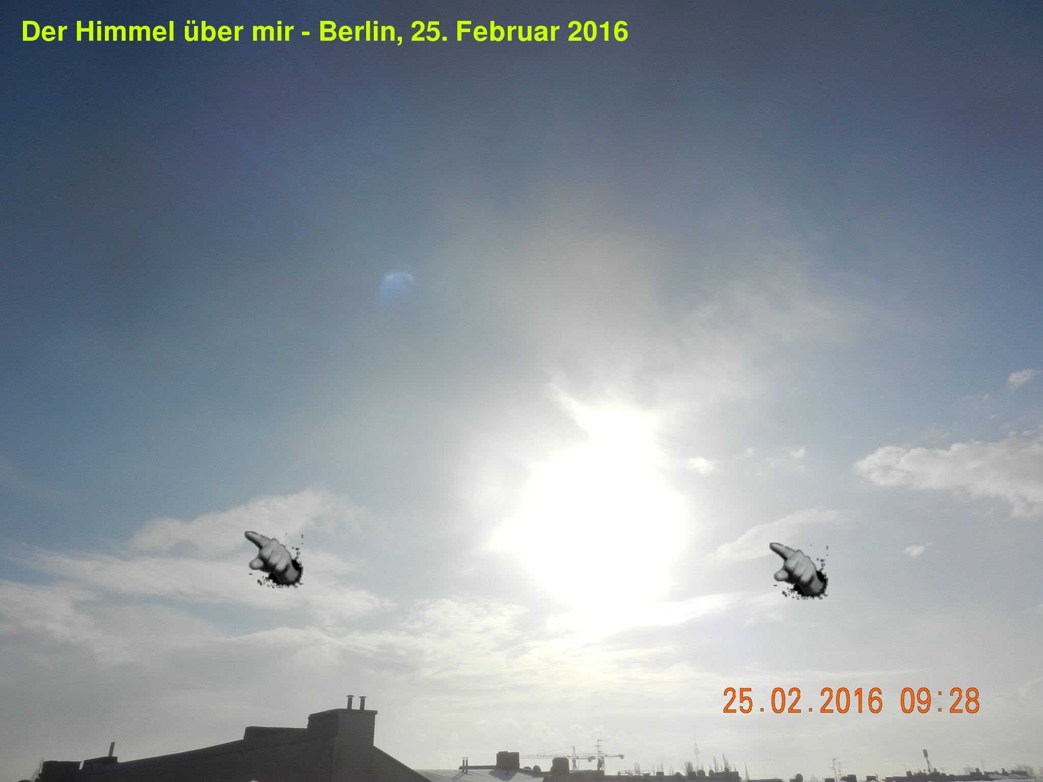 • Ich träume davon, diese Entitäten einmal auf frischer Tat zu erwischen. Dafür müßte man allerdings den ganzen Tag auf der Lauer liegen oder im Ansitz verbringen. Man weiß nie genau, wann diese Strichteufel auftauchen, wenn ich nicht „zufällig“ hochgeschaut hätte, wäre mir dieses Ereignis auch nicht aufgefallen.
