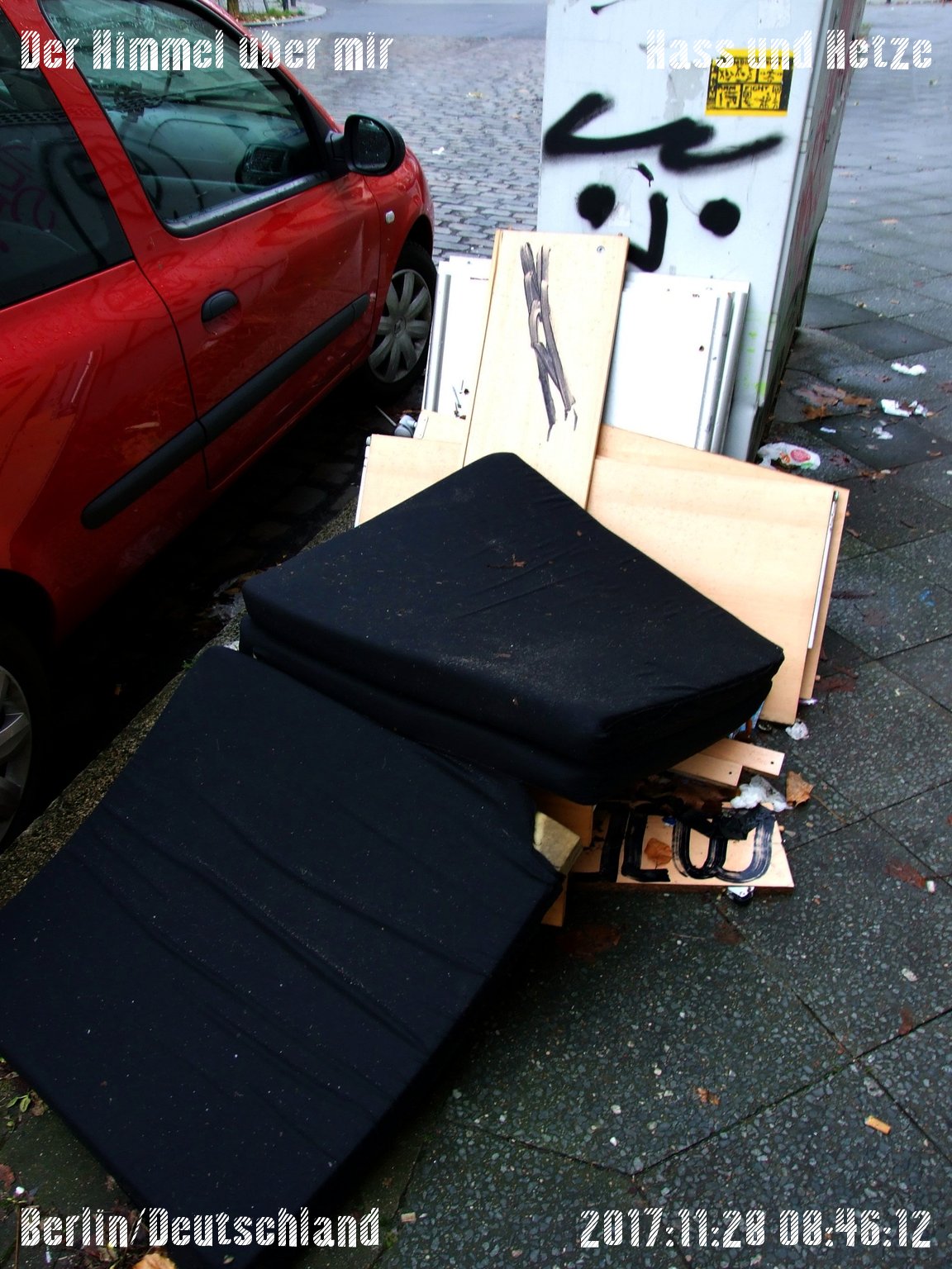 Der Müllmaler lässt auf sich warten. Vielleicht inspiriert ihn diese Matratze nicht oder die Zeit für hohe Kunst ist noch nicht gekommen. Vielleicht ist er auch entmutigt, weil er keinen Lohn bekommt. Oder er findet nirgends weisse Farbe.