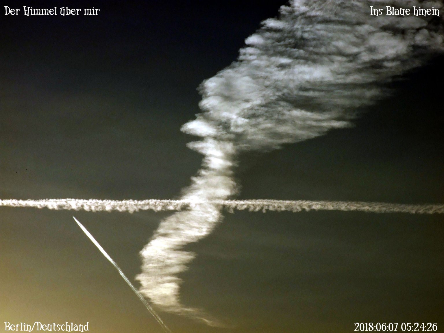 Der Himmel hat mir etwas zu sagen, deshalb möchte ich die Stimme vom Himmel nicht verpassen oder überhören. Ich versuche, die Zeichen meiner Zeit zu beurteilen, denn es liegt etwas in der Luft. Deshalb achte ich auf das Vorkriegswetter im Ankunftsklima.